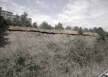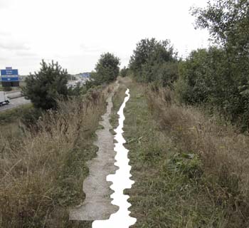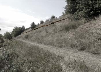 The path on the one side of the earthwall next to the highway is copies and casted in bronze and installed parallel to the highway on the other side of the earthwall.