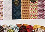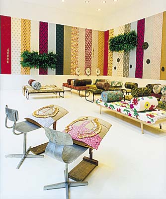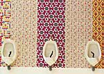 wallpaper, fern, gilded bronze drops, bronze tree-knots, textile, painted bedframes, aluminium chairs, bobbin lace, bronze bonsai trees, urinals, soap, different aroma-oils, soap-standards |